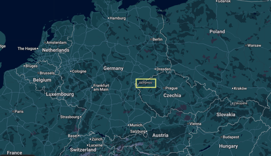 De adellijke familie von Schlick (voluit: zu Bassano und Weißkirchen) was de eigenaar van de grond en 10 jaar later een van de rijkste families in Bohemen, tot Ferdinand (koning van Bohemen, later keizer…) zich ermee begon te moeien. Graaf Stephan Schlick was in dezen het meest actief. Zijn wapenschild staat ook vaak op de zilveren munten die uit het erts geslagen werd: de munt uit Joachimsthal, de Joachimsthaler. Hieronder een afbeelding van de tweede reeks Joachimthalers. Het is een Guldengroschen “Joachimsthaler” uit 1525.