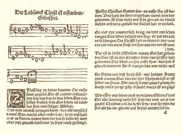 Christ lag in Todesbanden is een paaslied dat Luther in zijn eerste bundel gezangen van 1524 reeds publiceerde. En net als veel van zijn andere liederen is het geen originele schepping, maar een bewerking van traditioneel liedgoed, dat door de loop der eeuwen was beproefd en goed bevonden. Met dit lied bewerkt (en vernieuwt) Luther de tekst en de melodie van de elfde-eeuwse Paas-sequens Victimae Paschali laudes. (daarover later meer) En als Bach in zijn cantate alle 7 coupletten van dit lied van muziek voorziet, dan is steeds de melodie volledig aanwezig. Onder de afbeelding van de eerste druk van dit lied, vindt u een vierstemmige uitvoering van het eerste couplet.