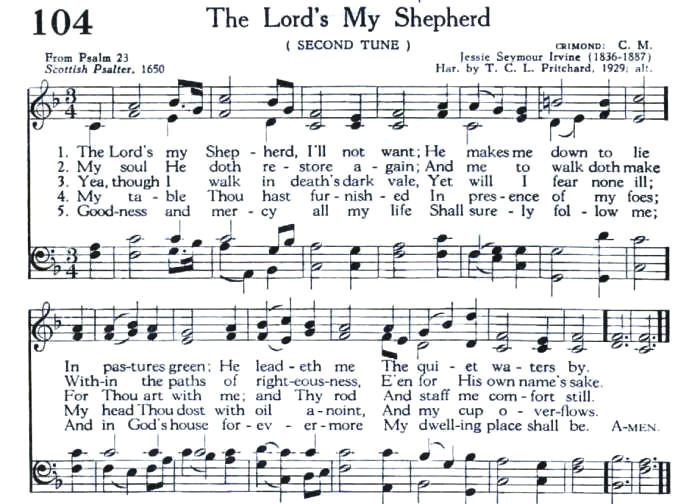 Het is een nieuwe berijming van Psalm 23 op de melodie van ‘The Lord’s my shepherd I’ll not want…’ Het Engelse origineel is bekend en geliefd. Ook in Nederland (via Evangelische middens binnengekomen, maar al lang breed geaccepteerd). De tekst is die van The Scottish Psalter (1650): heerlijk oud Engels dus. Zij is in de 19de eeuw voorzien van een goed in het gehoor liggende, soepel vloeiende melodie in 3/4 maat (Crimond).