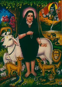 leefde, zwierf rond slechts gekleed in haar lange haarlokken. Op de leeftijd van tien jaar, werd zij ingewijd in de verering van Shiva, die zij de 'Heer Wit als Jasmijn' noemde. In haar poëzie gaf zij uiting aan haar 'verliefdheid op Shiva.' Zij zwierf door het land, een god-bedwelmde wilde-vrouw, zoekend naar haar goddelijke minnaar. |