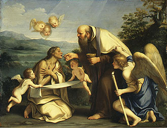 | Mijn verlangen ernaar was nog net zo groot als het was voordat ik de wereld verliet. Maar hier had ik vaak nauwelijks water terwijl ik brandde van de dorst en bijna bezweek door gebrek daaraan. Ook kwam er een waanzinnige begeerte naar losbandige liedjes in mij op, die mij erg verwarde en die mij er toe aanzette al die duivelse liedjes te gaan zingen die ik vroeger in de wereld geleerd had. Maar als zulke begeerten in mij opkwamen, sloeg ik mezelf op de borst en herinnerde mezelf aan de eed die ik gezworen had toen ik de woestijn introk. Ik ging dan in gedachten weer staan voor de beeltenis van de moeder Gods die mij met haar vertrouwen moed had gegeven, en ik bad huilend tot haar, en smeekte dat ze die gedachten zou verjagen waaraan mijn arme ziel ten onder ging. Als ik dan heel lang gehuild had en op mijn borst geslagen, dan kreeg ik tenslotte meestal een licht te zien dat van alle kanten op mij straalde, en meteen werd ik op de een of andere manier standvastig en sereen. | |