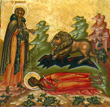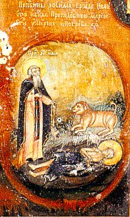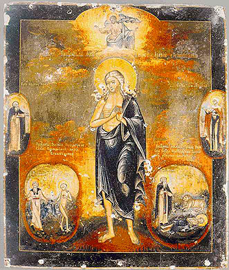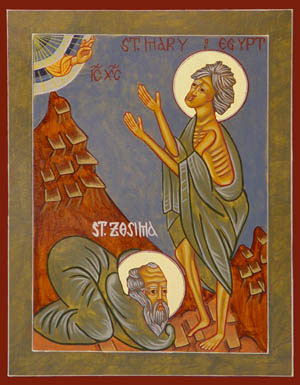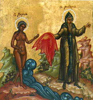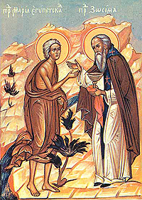monniken terugkeerden. Dat hele jaar zweeg hij, want hij durfde niemand iets te zeggen van wat hij gezien had, maar hij verlangde er erg naar haar dierbare gezicht weer te zien en bad in stilte steeds tot God hem dat nog eens toe te staan. Hij zuchtte over hoe langzaam het jaar leek te verstrijken. Toen de eerste zondag van de heilige vastentijd aanbrak, gingen alle anderen naar buiten onder het gebruikelijke psalmgezang, maar hij leed aan een lichte koorts waardoor hij in het klooster moest achterblijven. En Zosimas herinnerde zich hoe die heilige vrouw gezegd had: 'Zelfs al zou u willen weggaan, dan zou u dat niet lukken.' Na verloop van enige dagen herstelde hij van zijn ziekte, maar hij bleef in het klooster. |