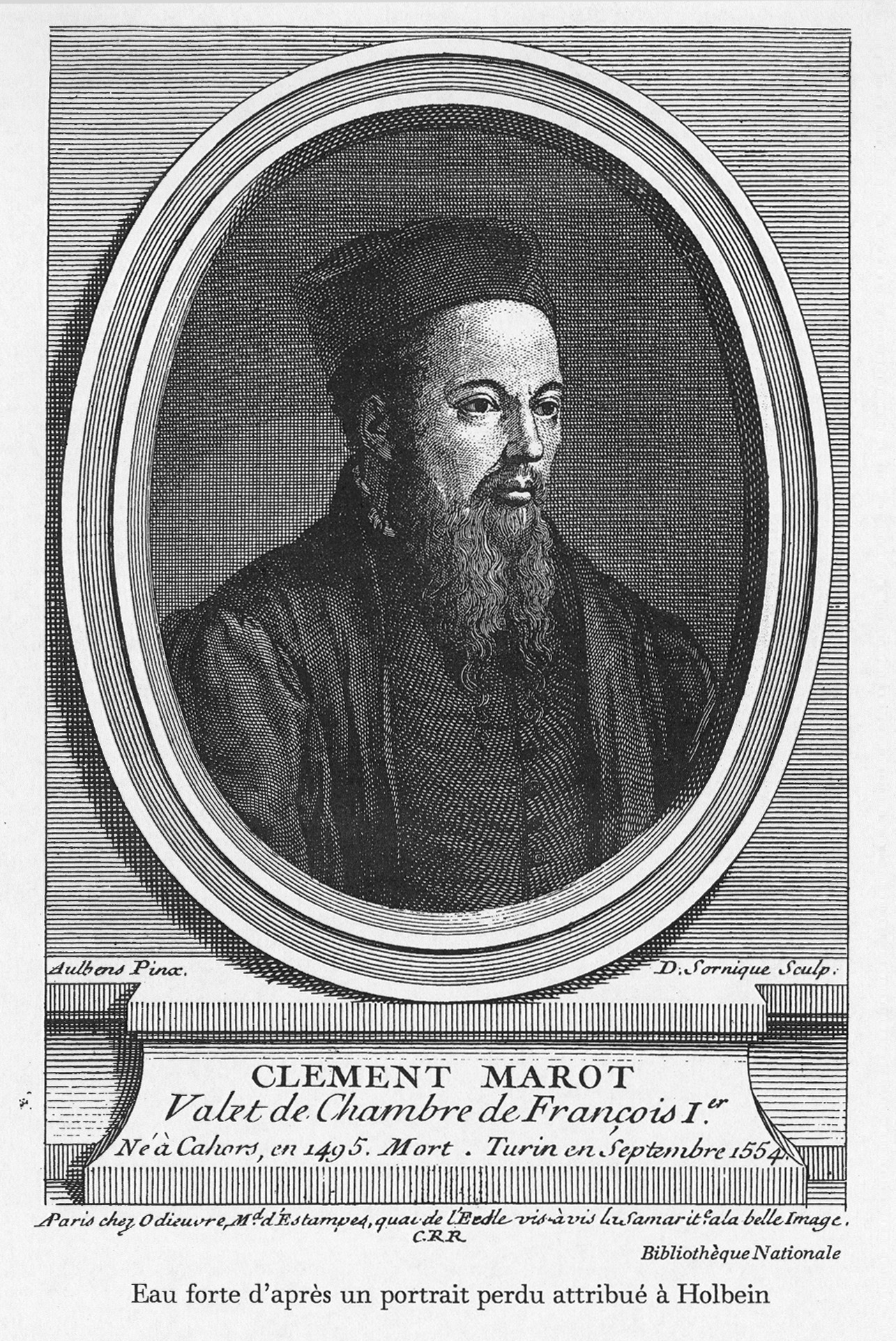 "Ayant travaillé à l'Ermitage, je connais bien ce dessin, qui est magnifique et, comme vous le dites très justement, assez méconnu. En ce qui concerne l'iconographie de Marot, le seul véritable portrait est le profil qui le montre barbu et les cheveux très courts. [...] Le dessin de l'Ermitage montre bien un personnage âgé, barbu et vêtu comme un magistrat ou un prélat. La barrette plate est typique des années 1540. L'annotation visible en haut se compose de deux parties : à gauche "de [puis d'une main plus ancienne, écriture du XVIe siècle] chambre du Roy" et à droite "clement marot poete [d'une autre main] valet". Les écritures à droite semblent du XVIIIe siècle. Ceci voudrait dire que le dessin était plus grand, possédait une annotation ancienne sur au moins deux lignes d'une main du XVIe siècle et uniquement à gauche. A la rognure, survenue au XVIIe ou au XVIIIe siècle, la partie découpée de l'annotation a été reportée à droite, puis complétée. Il n'y a aucune raison de douter de l'exactitude de cette reprise. Autrement dit, tout concorde pour que ce portrait soit bien celui de Marot. D'ailleurs, la barbe et les yeux un peu gros sont ceux du profil. La seule différence est le nez qui paraît plutôt busqué, alors que dans la gravure il est droit. Quant à "Du Moustier" inscrit dans le cartouche, c'est le nom apposé par le fils de Cobenzl lorsqu'il cataloguait la collection de son père. Tous les dessins de cette provenance achetés par Catherine la Grande en 1768 possèdent ces montages violets et ces cartouches avec des attributions. Pour ce dessin, le nom choisi est le seul connu à l'époque : tous les portraits français de la Renaissance de la collection Cobenzl sont attribués à un "Du Moustier" sans prénom, qui semble être Daniel, portraitiste du XVIIe siècle, plutôt que ses oncles Etienne et Pierre ou son grand-père Geoffroy, totalement oubliés au XVIIIe siècle. La manière de ce dessin ne ressemble à rien de connu. Elle est aussi très différente du portrait de Geoffroy qui n'était pas portraitiste. Pour Marot, la main n'est pas celle de François Clouet qui est le peintre du roi à l'époque. Il faut imaginer un autre artiste qu'il est impossible de nommer à ce stade."