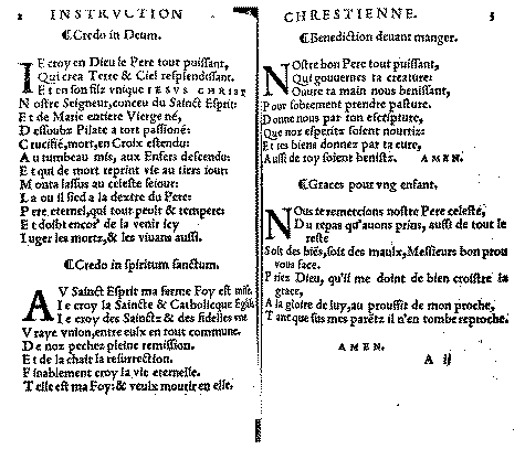 In 1533 (a kind of Evangelical Wonder Year in France with the King’s Sister Marguerite in charge in Paris and the Lenten sermons of Gérard Roussel in the Louvre) Clément Marot started to supply the Evangelical movement with some basic religious texts in the vernacular. The first specimen appeared in a Lyonnese reprint of the first collection Marot’s poetical Works (L’Adolescence clementine)> The first - official -edition had appeared in Paris in 1532 and was a huge success. François Juste, a Lyonnese printer, also published this popular book on 23 February 1533 and added some extra material: a verse translation of the Lord’s Prayer and the Creed (in two parts) "Les Articles de la Foy", introduced by the publisher as Le Pater noster, et le Credo en francoys faict et traduict par ledict. C.M. et offert na guyeres a la Royne de Navarre.[1]This edition was not ‘officially’ supervised by Marot. To these two fundamental texts Juste added a prayer before dinner, Benediction devant manger (“Nostre bon Pere tout puissant”) in a reissue of L'Adolescence clementine at 12 July 1533, the ensemble now being introduced as Foy d’ung chrestien.[2] Marot’s authorship is only established for the Creed and the Lord’s Prayer, since he himself included them in later editons. The prandial prayer he never republished although in clandestine editions they were retained. Quite a common practice in the 16th century, resulting in insolvable questions about authorship. For the 16th century reader they were Marot’s. This prayer was put to music by Crispel. About the same time the same prayers (Creed, Lord’s Prayers, Benediction) appeared in print as the last part of a curious amalgam of Evangelical epistles dealing with prayer, published in Paris by Antoine Augereau: Epistre familiere de prier Dieu. Aultre epistre familiere d’aymer chrestiennement, followed by a tract dealing with the proper way to write French: Briefve doctrine pour deuement escripre selon la propriete du langaige francoys. The the title of the prayer section in this publication is L’Instruction et Foy ung Chrestien. [3] Still in 1533 the same printer, Antoine Augereau, (re-)issued Marguerite’s devotional book: Miroir de l’ame pecheresse three times, first anonymously, afterwards openly and in an expanded version with Marot’s verse translation of Psalm 6 at the end (for the first time in de second Augereau print of 1533. At the same time,he reissued the mixed treatise about prayer and orthography not only expanding the orthographic tract but also adding two new prayers to the Instruction: a French translation of the ‘Ave Maria, La Salutation Angelique",the Angelic Greeting (“Esjouys toy Vierge Marie”)[4] and a Graces pour ung enfant; a postprandial prayer (“Nous te remercions nostre Pere celeste”). This edition of the Epistres–Doctrine–Instruction appeared in December 1533. It was reprinted shortly afterwards.[5] This substantial production and publication of devotional texts reveals that Marot in 1533 was actively involved in the Evangelical movement around Marguerite d’Alençon (later to become Queen of Navarre). Enlarged with Psalm 6, the Instruction et Foy d'ung chrestien" (1533) was integrated in the second edition of La Suite de l'Adolescence clementine, even figuring prominently at its beginning(Paris, Veuve P. Roffet, 1534; Mayer n° 17). It got a title: Instruction Chrestienne. Since it is not sure whether Marot really authorized this edition, there is no conclusive evidence of authorship: