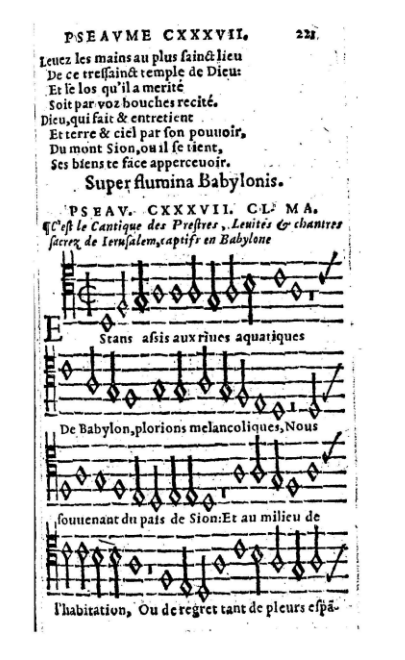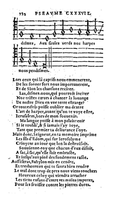 To be able to follow the text and the melody: psalm 137 from the Psaumes Octantetrois edition of 1554. [interesting detail: there is a difference in the final lines. The soprano sings "...de ta mamelle impure / pour les froisser contre la pierre dure". This is the original text of Marot (all mss, eds. 1539, 1542, 1543-Roffet). In the 1543-Geneva edition this was changed in what is printed below. The original however was restored in 1562].