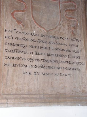 The reason why he was buried in the Turin Cathedral is also mentioned: He was related to (‘nepos’) Domenico della Rovere himself, in the text simply referred to as the cardinal of S. Clemente (‘cardine[us] Sancti Clementi’). Cristoforo di Ceva died 15 May 1516. We can assume that the stone was fix and firm at that particular place when in 1544 Jamet’s epitaph for Marot was to be placed on a wall near the door.