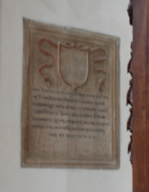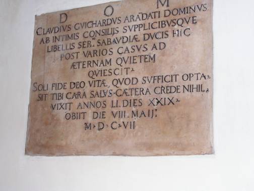 On the opposite wall (left when entering the church) a stone remembered that that Claude Guichard was buried there, counselor and historiographer of the Duke of Savoy, a famous archeologist (specialized in ancient funeral rites) and French poet as well. The epitaph informs us that he had died 8 May 1607.27