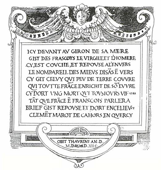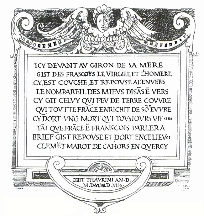 Epitaphe sur le tombeau de Marot, Faict par Lyon Jamet, insculpé en marbre en l’Eglise Saint-Jean de Turin, 1544, le 12 septembre.