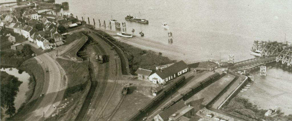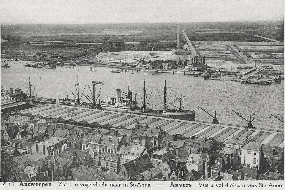 Wie vroeger (voor de treintunnel er was = 1970) met de trein uit het Waasland kwam, geraakte niet verder dan Linkeroever, op het Vlaams Hoofd (een oud fort). Daar was een station (Pays de Waes, later ‘Antwerpen-Linkeroever’). Vandaaraf nam je de (stoom)boot. Je stapte uit op de St. Michielskaai en via het Zuid-Station (nu Justitiepaleis) kon je dan dat deel van Vlaanderen dat over de Schelde ligt, verder verkennen per trein. Op de pas gerestaureerde toeristische kaart van Antwerpen (gemaakt voor de Wereldtentoonstelling 1894) kun je dat allemaal heel mooi zien (hier het relevante gedeelte. De hele kaart kunt u zien als u op de afbeelding klikt (website van UAntwerpen) Daaronder een luchtfoto van later datum in tegengestelde richting…
