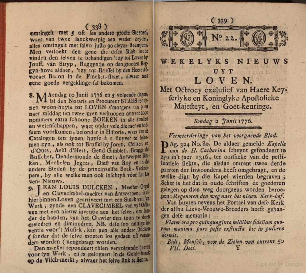 JEAN LOUIS DULCKEN, Meester Orgel en Clavecimbel-maeker van Antwerpen, is al hierbinnen Loven gearriveert met een Stuck van syn Werk, zynde een CLAVECIMBEL van vyf Octaven met een nieuw inventie aen het selve, om sonder de handen, van het Clavier den toon te doen crescéren en diminuéren. NB. dese soo nuttige inventie voor ‘t Musiek, kan aen alle andere stucken (sonder dat de selve moeten los gedaen oft verandert worden) aengebragt worden. Den maeker repondeert thien vervolgende jaeren Voor syn Werk, en is gelogeert in de Gulde-handt op de Visch-markt, alwaer het selve stuk te sien is