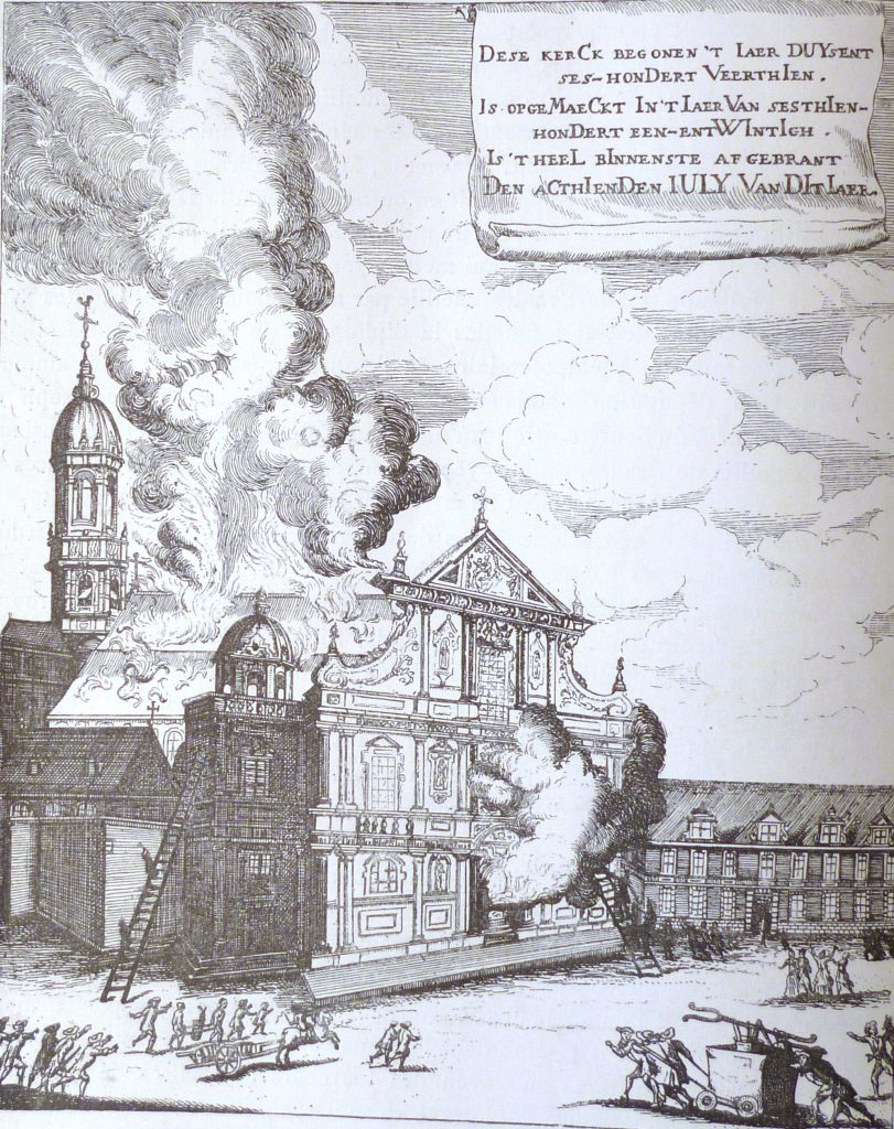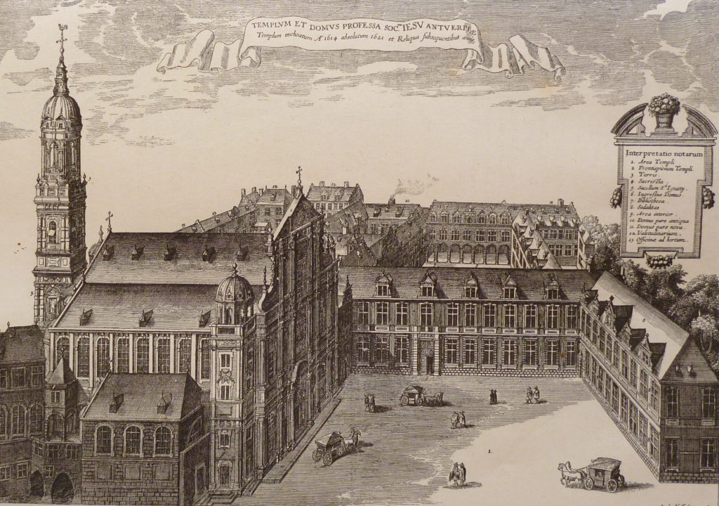 Hieronder twee historische prenten van deze kerk, oorspronkelijk de kerk van St. Ignatius geheten. By far de duurste kerk van de contrareformatie in ‘t stad. Zelfs echte roomskatholieke believers vonden het soms wel wat teveel. Afin, daarover gaat het nu niet. In 1718 ging het hele interieur in vlammen op (incl. Rubens die het schilderwerk had verzorgd… ) , In 1718 was het de bliksem, in 2009 de electriciteit (van lichtspots).