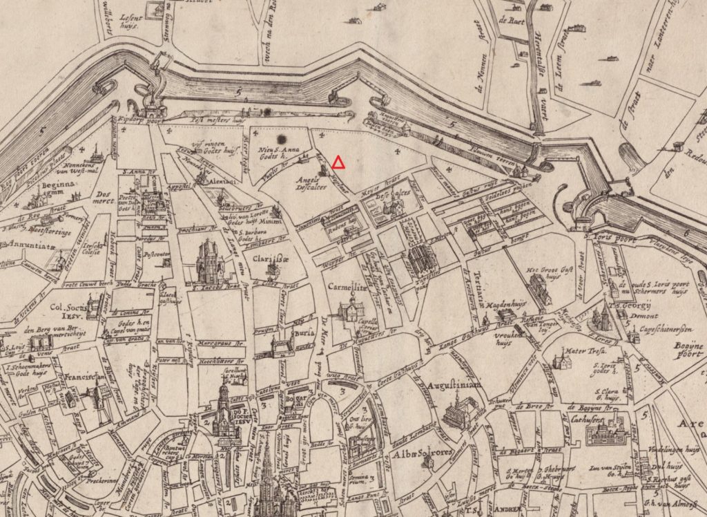 Johan Daniël Dulcken, de klavecimbelbouwer woonde volgens een advertentie in de GvA van 17561 “in ‘t Hoplant over de Engelsche Theresen”. Hier dus: