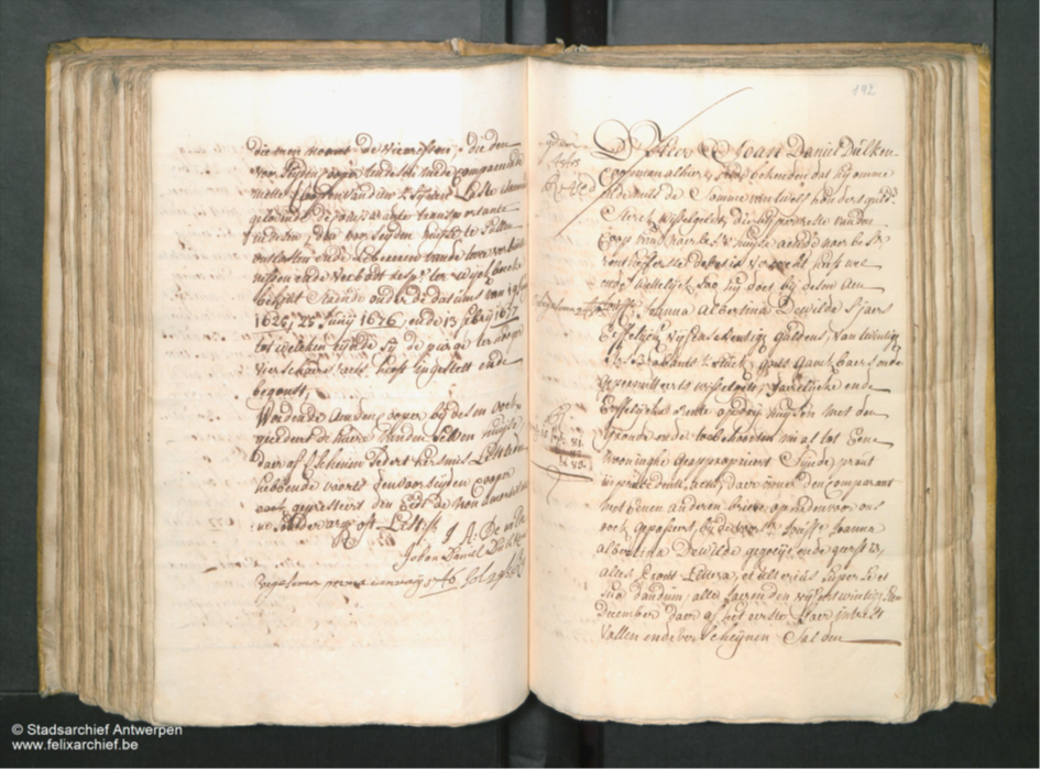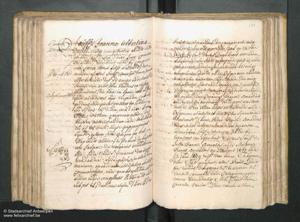 Dewilde eenige naergelaeten kiidt ende dochter van wijlen D’heer Joan Cornelis De Wilde, ongehout ende by comperitie van Jaeren haers selfs wesende, daer moeder af was Jouffe Maria Catha[rina] Francese Bernaldes ende bekende dat sij omme ende mitsdi somme van acht tien hondert en vijftig guldens eens, die haar in specie van wissel gelde al ende wel sijn vergouden, vercocht gecedeert, ende getransporteert te hebben soo sij doet bij desen, aen d’heer Joan Daniel Dülken Coopman alhier, drij huijsen mettengronden ende toebehoornden nu al tot eenen huijse geapproprieert sijnde, gestaen ende gelegen in het Hop landt alhier, tusschen de huisinge van Jaspar De Verginis aen d’enen sijde, ende thuijs genaemt den Arent aen d’ander sijde, gelijck & in allen der manieren, op ende met alsulcken servituden Commoditeyten, ende gerechtigheden als de selven huijse eenigsents hebbende subject is, daer inne wijlen d’ heer Pedro // Franceze Bernaldes der Comparante entg moederlijcken over groot vader was op 23: 7ber 1648 bij sonr Danel Deeghbroot voor heeren schepenen deser stadt gegoeijt ende geërft is, aende Comparante in desen competerende als eenige naergelaeten kindt ende Erfgenaem abintestato vanwijlen haere voorseijde moeder, die eenige naegelaeten kint ende dochter was, mitsgrs: Erfgenaem ab intestato, soo sij ten desen verclaerde van wylen d’heer Emanuel Francez Bernaldes een den welcken een gerecht derde paert was toecomende in den selven huijse als kindt ende mede Erfgenaem ab intestato van wijlen sijnen vader den voorsz d’ heer Pedro Francez Bernaldes den welcken de twee resterende derdepaerten in denselven huijse vercegen hadde bij transport van sijne twee susters Jouffren Suster Francez Bernaldes, en de Margareta Frances Bernaldes op 23 Meert 1677 ende 25: 7ber 1679 resp:s voor heeren Schepenen desen Stadt gepasseert, alles Prout Littere quas tradidit …