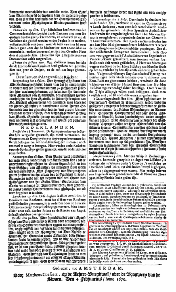 - Deze verantwoording is getriggerd door de publicatie van Petrus Appeldoorn, waarvan hieronder de 2de druk wordt aangekondigd (1670): Tot Middelburgh, by Hendrick Smith Boeckverkooper, is gedruckt en werdt uytgegeven, D. Petrus Appeldoorns Tractaet van de Godtheydt Chriſti des Heyligen Geeſtes, ende der Goddelijcke Dry-Eenigheyt, met een wederlegginge van den afgewekenen Predicant Johannes Becius, nu zijnde Remonſtrants Lidtmaet, den tweeden Druck, in 8. (Amsterdamsche Courant 1670, nr. 5, p. 2)