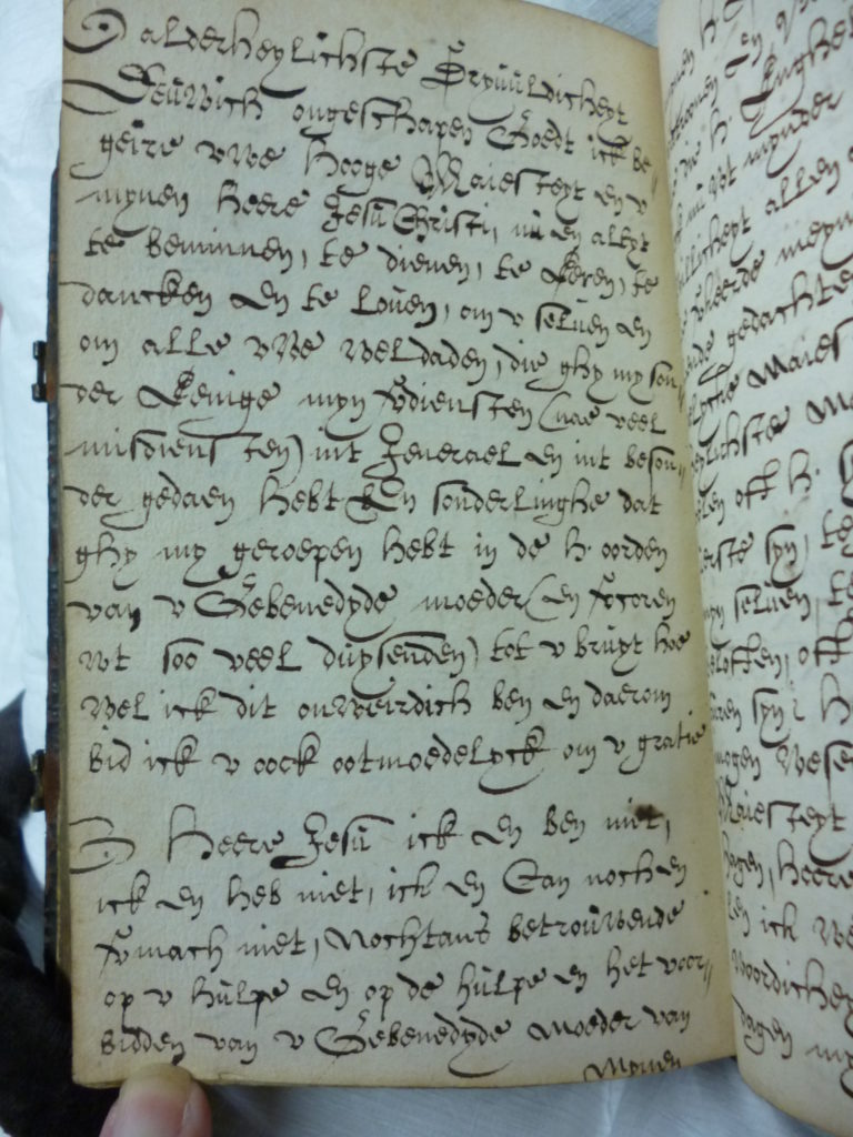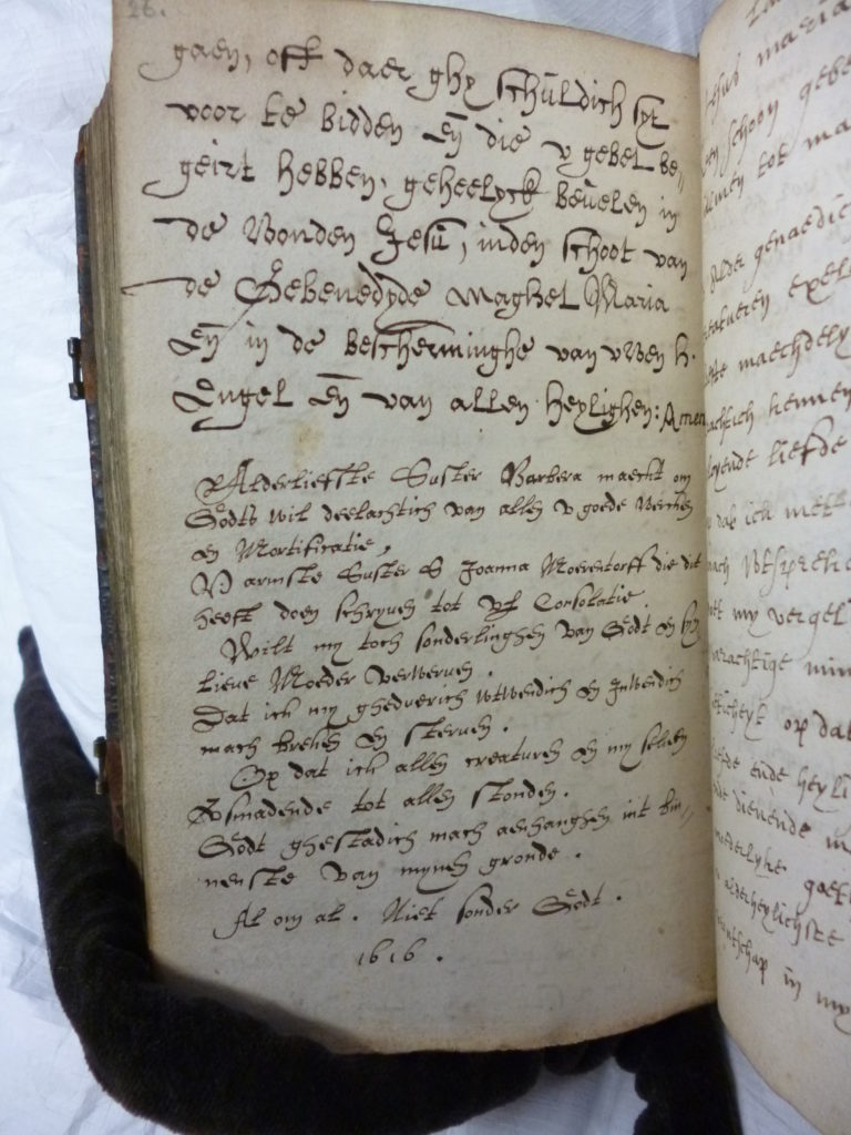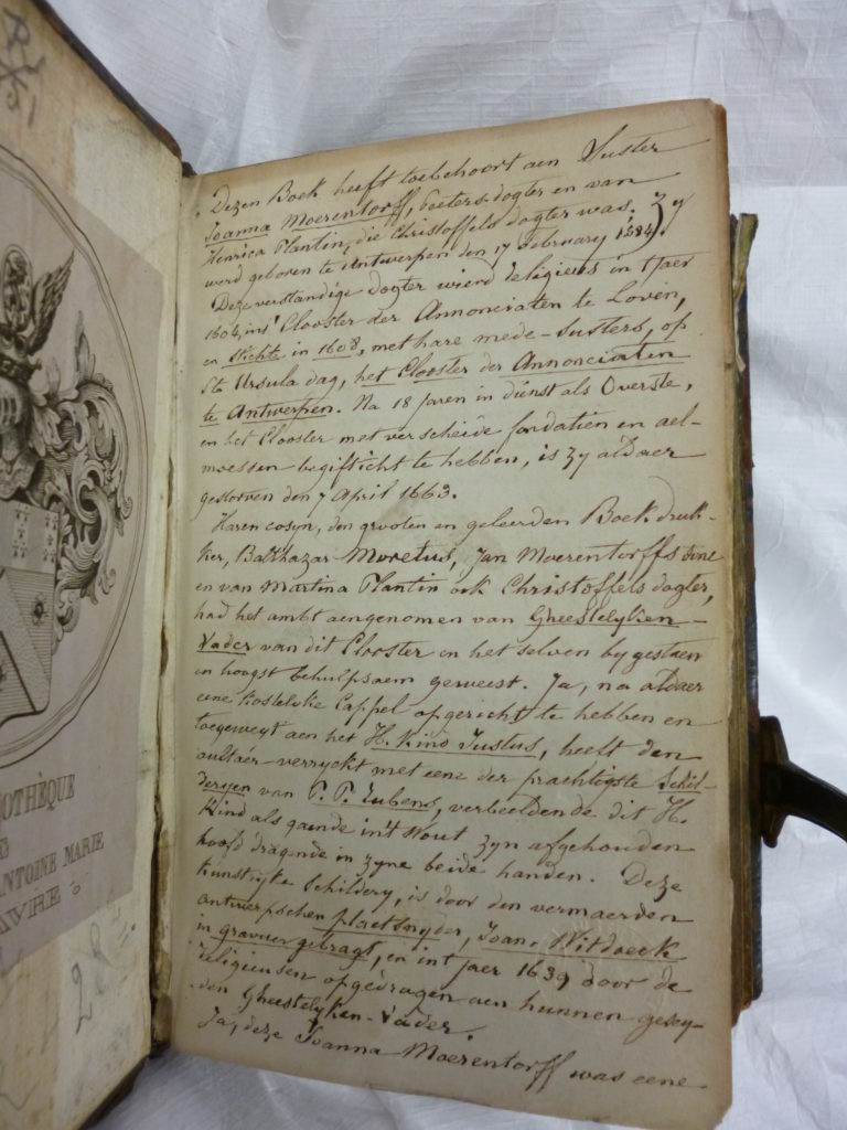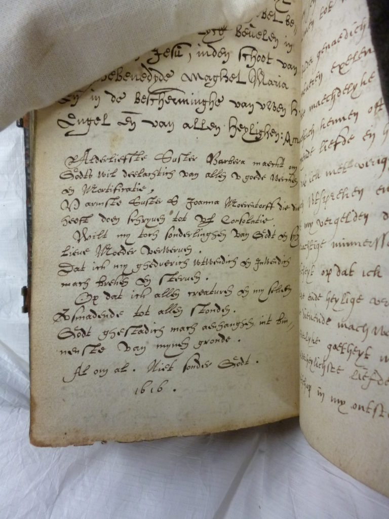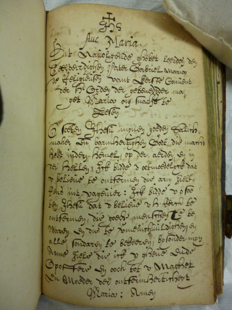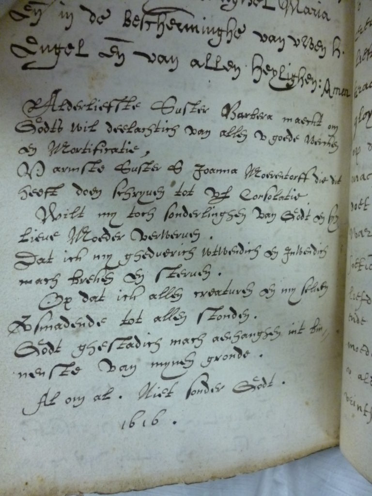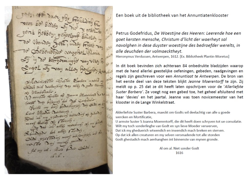 In dit boek bevinden zich achteraan 84 onbedrukte bladzijden waarop met de hand allerlei geestelijke oefeningen, gebeden, raadgevingen en regels zijn geschreven voor een Annuntiaat te Antwerpen. De bron van het eerste deel van deze teksten blijkt Jeanne Moerentorff te zijn. Zij meldt op p. 25 dat ze dit heeft laten opschrijven voor de ‘Allerliefste Suster Barbera’, die ze in een rijmend gebed aanspreekt en bidt om ook voor haar te bidden.