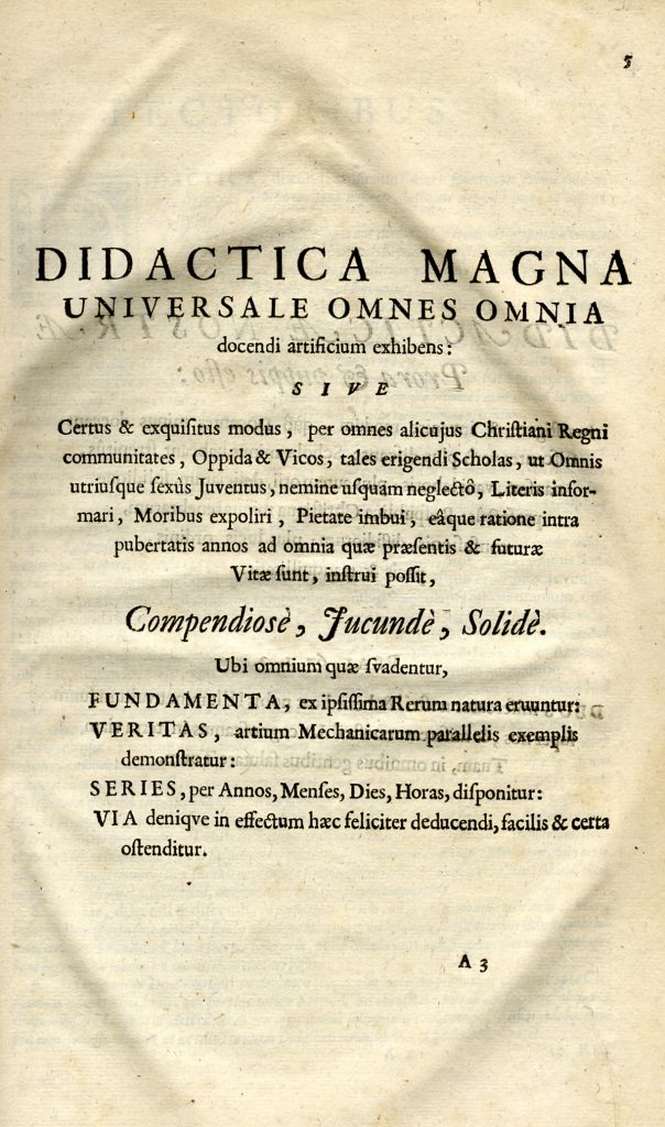 Dit is een “betrouwbare en voortreffelijke gids om in alle gemeenten, steden en dorpen van elk christelijk land scholen te stichten waarin de hele jeugd, zowel jongens als meisjes, niemand uitgezonderd, in kennis worden gevormd. Als zodanig dienen deze scholen er ook toe om hun moreel gedrag te verbeteren. hun geloof te versterken, om zodoende in alle dingen van het tegenwoordige en toekomstige leven te worden gevormd. Deze vorming dient snel, prettig en grondig te gebeuren.” Dit is de openingszin (of om precies te zijn de originele titelpagina) van het didactisch handboek dat Jan Komensky (Comenius) in 1657 in Amsterdam liet verschijnen: