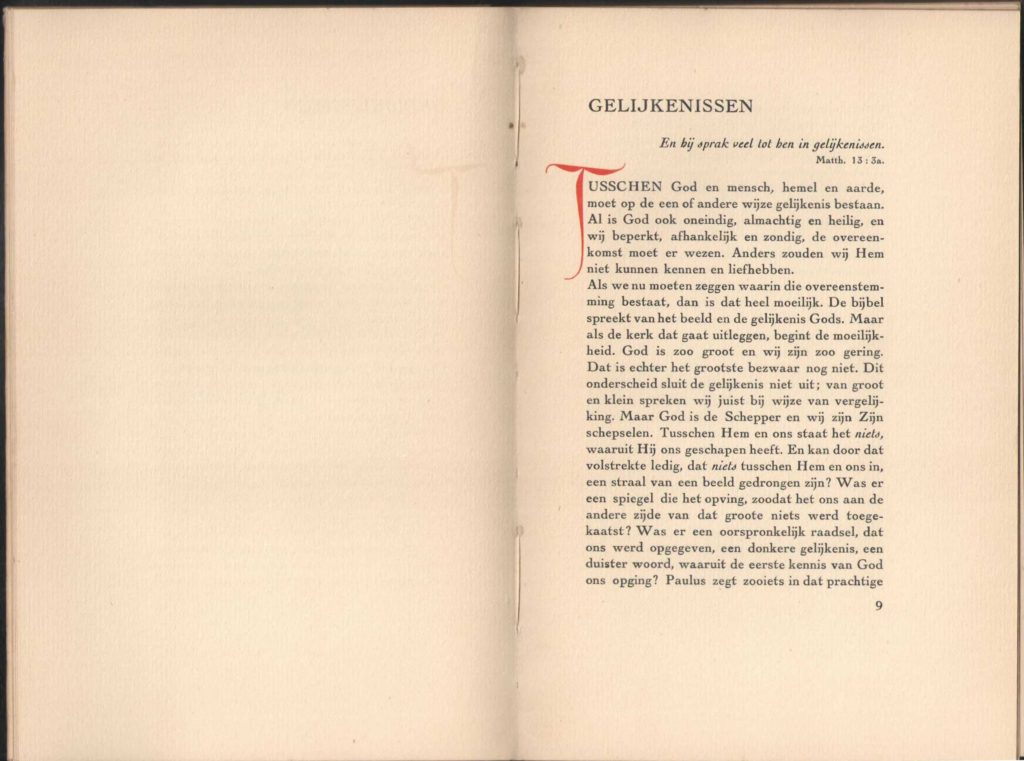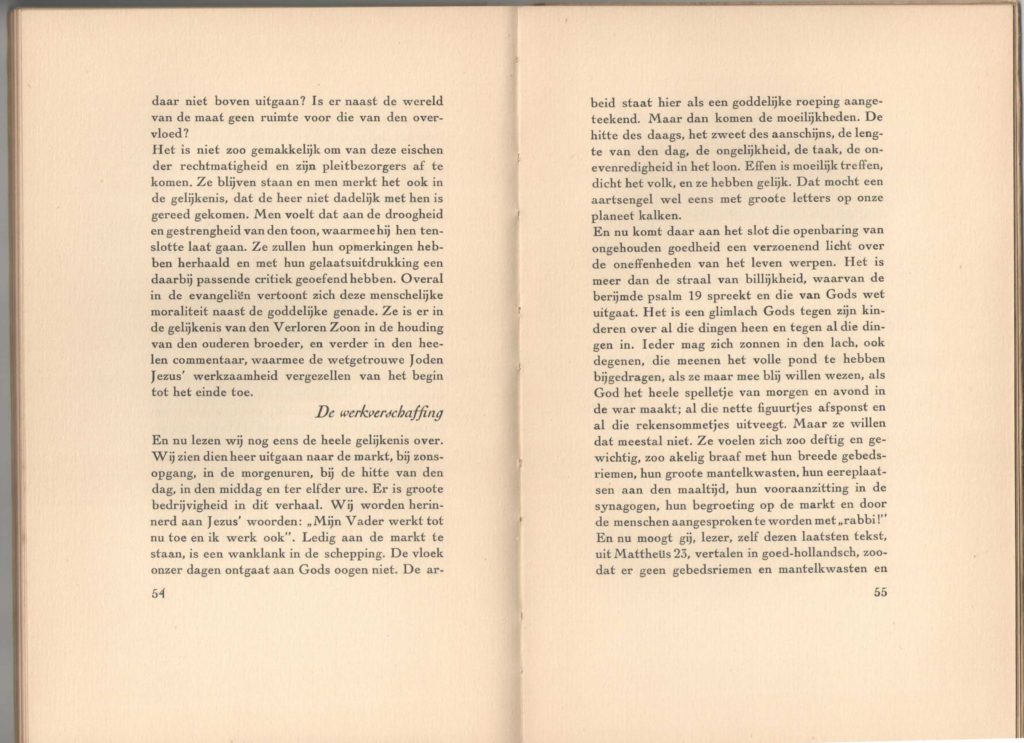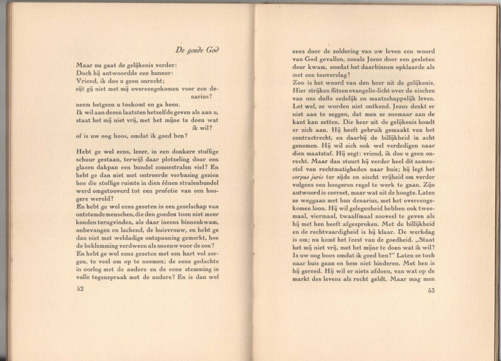 Is uw oog boos omdat ik goed ben?” Laten ze toch naar huis gaan en hem niet hinderen. Met hen is hij gereed. Hij wil er niets afdoen, van wat op de markt des levens als recht geldt. Maar mag men daar niet boven uitgaan? Is er naast de wereld van de maat geen ruimte voor die van den overvloed? Het is niet zoo gemakkelijk om van deze eischen der rechtmatigheid en zijn pleitbezorgers af te komen. Ze blijven staan en men merkt het ook in de gelijkenis, dat de heer niet dadelijk met hen is gereed gekomen. Men voelt dat aan de droogheid en gestrengheid van den toon, waarmeehij hen tenslotte laat gaan. Ze zullen hun opmerkingen hebben herhaald en met hun gelaatsuitdrukking een daarbij passende critiek geoefend hebben. Overal in de evangeliën vertoont zich deze menschelijke moraliteit naast de goddelijke genade. Ze is er in de gelijkenis van den Verloren Zoon in de houding van den ouderen broeder, en verder in den heelen commentaar, waarmee de wetgetrouwe Joden Jezus’ werkzaamheid vergezellen van het begin tot het einde toe.