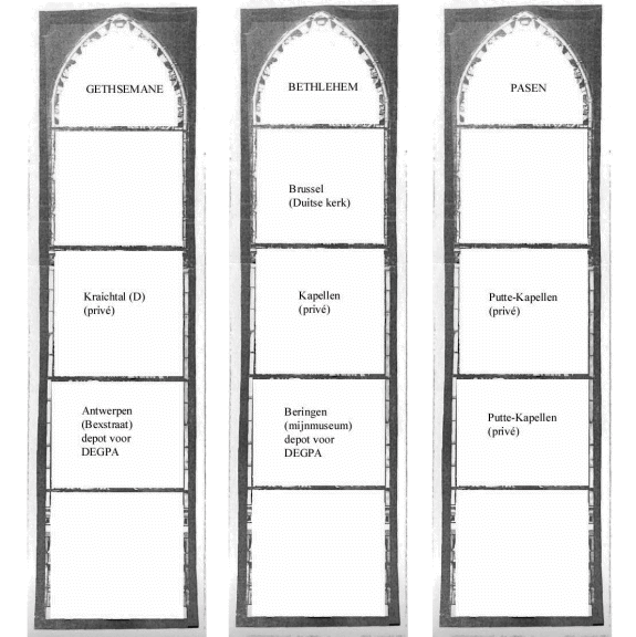 De huidige situatie van dezelfde panelen, resp. in Beringen (mijnmuseum), Kapellen (privé) en Brussel (kapel van de Duitse kerkgemeenschap):