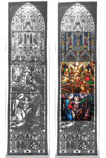Enkel van dit venster is een originele afbeelding bekend: afkomstig uit de het fotoboek van de archieven van de Köngl. Hofmalerie F.X. Zettler. De afbeelding links is de originele foto, rechts zijn de drie geconserveerde panelen te hunner oorspronkelijke plaatse op de foto geplak.