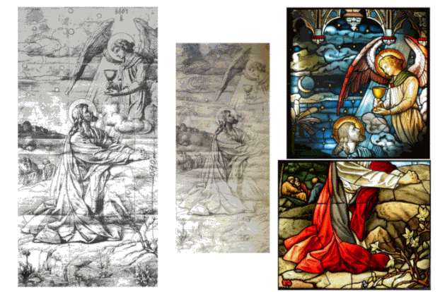 De glasramen zijn geschilderd door glasschilder, Franz Xavier Zettler (= Königliche Hofmalerei München). Het archief van deze indertijd wereldberoemde Glasmalerei is in 1939 terecht gekomen bij de Franz Mayer'sche Hofkunstanstalt München (na een fusie van beide bedrijven), maar gedeeltijke verloren gegaan in de oorlog. Tijdens het kunst-historisch onderzoek door mw. Ibanez werd een werktekening van het middelste venster teruggevonden en twee voorbereidende schetsen voor het linkerglasraam dat zij aan het restaureren was. (zie onder)
