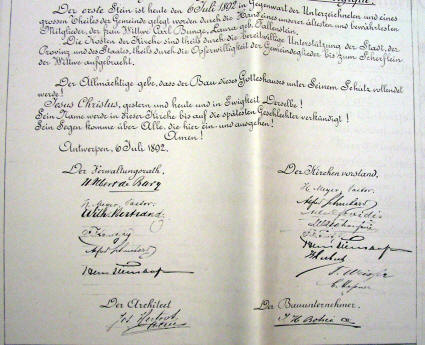 1892: eerste steenlegging Op 1 juni 1892 werd de eerste spade in de grond gestoken en op 6 juli 1892 verrichten de drie oudste gemeenteleden de eerste steenlegging: Frau Wwe Bunge (= Laura Fallenstein), Frau Wwe Herberts en Frau Wwe Brosy. Met de eerste steen werd ook een document ingemetseld. Een afschrift hiervan (zie foto hiernaast) en een gecalligrafeerde gedrukte versie bevinden zich in het archief. Op 10 december werd de kerk ‘gericht’ (?) en op 20 mei 1893 stond het kruis op de toren. Op 1 oktober werd de eerste kerkdienst in het nieuwe gebouw gehouden (natuurlijk over de toepasselijke tekst van psalm 84: "Wie lieblich sind deine Wohnungen, Herr Zebaoth" 1893: plechtige inwijding Op allerheiligen, 1 november 1893 vond de plechtige en feestlijke inwijding van het nieuwe kerkgebouw plaats. In aanwezigheid van talrijke autoriteiten, maar liefst 24 geestelijken in vol ornaat mocht de vriend van het eerste uur, Pastor Fuchs de kerk inwijden, waarna de Pastor loci, H. Meyer, de feestpredikatie hield. De Duitse ‘Liedertafel’ zong, muziekdirecteur Jan Blockx dirigeerde het orkest (o.a. een deel van een symfonie van Beethoven. Na de Groote Oorlog wordt de straat die naar De Bary was genoemd, herdoopt in de Blockxstraat). Het orgel (een Walcker-orgel met 20 spelen, 2 manualen en pedaal) was al wel geschonken (fam. Konitzky), maar kon pas op 1 juli 1894 in gebruik genomen worden. Na afloop van de dienst overhandigde de vertegenwoordiger van de Duitse gezant te Brussel, prins Thurn und Taxis, aan dhr. Alfred Schuchard, de kroonorde III. klasse. Uit de Protokollbücher is duidelijk dat hij de drijvende kracht achter de kerkbouw was. Tevens was hij op ogenblik voorzitter van de Kirchenvorstand. Een uitgebreid verslag is te lezen in Le Précurseur. De Christuskirche van 1893 tot 1918 Na de bouw stijgt het aantal leden nog gevoelig: van 786 in 1893 tot 1035 in 1900 en 1208 in 1904. Daarbij moeten dan nog zo’n 250 gastleden (Hospitanten) geteld worden. De leden komen uit Antwerpen-stad, maar ook uit de wijde omgeving. In de zomer van 1911 vindt er een briefwisseling (gebundeld en uitgegeven: Schriftverkehr zwischen den beiden Deutschen Evang-Protest. Gemeinden zu Antwerpen zwekcs Herbeiführung einer Annäherung resp. Einigung derselben, Antwerpen: Sommer 1911) plaats met betrekking tot een nauwere samenwerking van de beide Duitse kerken. De beide gemeenschappen zijn evenzeer door de stad verspreid en zowel sociaal als familiaal nauw met elkaar verbonden. De toenadering gaat uit van de Lange Winkelstraat. In 1900 hebben zij overwogen om een geschiktere locatie voor hun eredienst te zoeken. Dit hebben zij niet gedaan omdat zij het hun christenplicht vonden deze locatie te behouden voor het Antwerpse ‘Protestantisme’ (en op te waarderen: renovatie, glasramen, Walcker-orgel etc… is toen door de Duitse gemeente bekostigd) èn omdat ze hoopten dat een toenadering tot de Christuskerk zich zou doorzetten. Er werd immers meer en meer samengewerkt rond bijzondere gelegenheden [vooral: feestdiensten ter gelegenheid van keizerlijke verjaardagen en andere typisch duitse gedenkdagen !]. Nadelen van de kerk aan de Lange Winkelstraat waren: ongunstige ligging, slechte akoustiek, het moeten delen met de Hollanders. Voordelen: grotere altaarruimte en ruime voorhal. Het komt niet tot een bijzonder besluit, behalve dat men over en weer gastvrij wil zijn. m.n. dat de gemeente van de Lange Winkelstraat de Christuskirche mag gebruiken voor erediensten ná de gewone uren. In de armenzorg en het schoolbestuur wordt samenwerking nagestreefd, resp. verder uitgebouwd. Een interessant argument in dit geheel is dat de Christuskirche liever niet spreekt van de ‘Duitse kolonie’ en haar belangen, maar drukt op het feit dat beide kerken lid zijn van de Belgische synode en dat het merendeel van haar leden wel duitssprekend is, maar inmiddels de Belgische nationaliteit heeft. Merkwaardig is in dit verband dat de Christuskirche niet bij de duitstalige afdeling van de synode hoort (Lange Winkelstraat wel) maar bij de franstalige. Haar officiële naam is ook de franse ! Pfr. Meyer gaat in 1911 met pensioen en wordt opgevold door Pfr. Frick. De gemeenschap scheurt uiteen als de oorlog uitbreekt. Vele leden hebben een dubbele nationaliteit, sommigen zijn volledig Belgisch. Op 9 oktober 1914 valt Antwerpen. Veel tot Belg genaturaliseerde en/of in hun hart meer Belg dan Duitser zijnde leden van de Duitse protestantes gemeenschap (zowel Lange Winkelstraat als Christuskirche) raken in de problemen, zeker als de Duitse bezetter als vanzelf de diensten van de kerken voor zich opeist (incl. de aanstelling van aalmoezeniers en predikanten). In de Lange Winkelstraat leidt dit niet tot grote discussie, maar stappen wel een groot aantal leden op. In de Christuskirche wordt de vraag of de kerk bij de Duitse Landeskirche moet aansluiten of bij Belgische synode blijven, tot een hevig bedsicussieerd punt. Pfr. Frick wordt legeraalmoezenier en trekt 100% de Duitse kaart. Over de Duitse kolonie geprangd tussen twee loyaliteiten, zie het artikel van Antoon Vrints, De 'Klippen des Nationalismus'. De Eerste Wereldoorlog en de ondergang van de Duitse kolonie in Antwerpen”, in: Bijdragen tot de Eigentijdse Geschiedenis, nr. 10, 2002, p. 7-41. Hier de passage over de discussie in de protestantse kerken, m.n. in de Christuskirche. De titel is ontleend aan de notulen van één van hun kerkraadsvergaderingen. Hevig verzet is er vanwege twee vooraanstaande leden in de kerkraad: dhr. Schuchard en Davidis, die beiden de ganse oorlog hier tegenin zijn gegaan. Zij drongen aan op een gemeentevergadering om hierover te stemmen. Deze is er nooit gekomen, want toen het zover was, was het oorlogstij al definitief gekeerd. Reeds in mei 1915 hadden echter een aantal andere leden contact gelegd - via Albert Oboussier - met ds. Kennedy Anet (secretaris van de Belgsiche Christelijke Zendingskerk, Eglise Chrétienne Missionair Belge) te Brussel om in Antwe