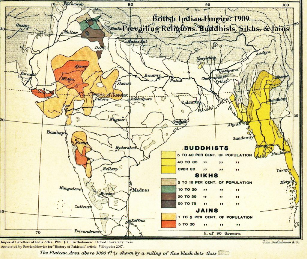 Eerst de indeling per dominante religie in percenten. Ik begin bij de minoriteiten: Boeddhisten, Sikhs en Jains. U ziet rechts Birma (Myanmar)