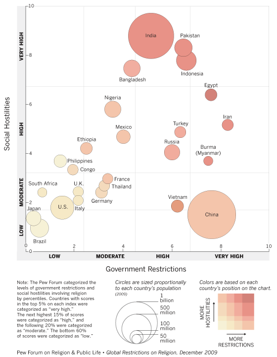 Soms zeggen ‘geplotte afbeeldingen’ meer dan woorden. Van de site waarop het Pew-research centrum zijn onderzoeksgegevens deelt, haalde ik het overzicht van de officiële inperkingen van de godsdienstvrijheid (horizontale as), afgezet tegen het vijandig gedrag dat de bevolking toont t.o.v. bepaalde religieuze groepen (verticale as). Dus