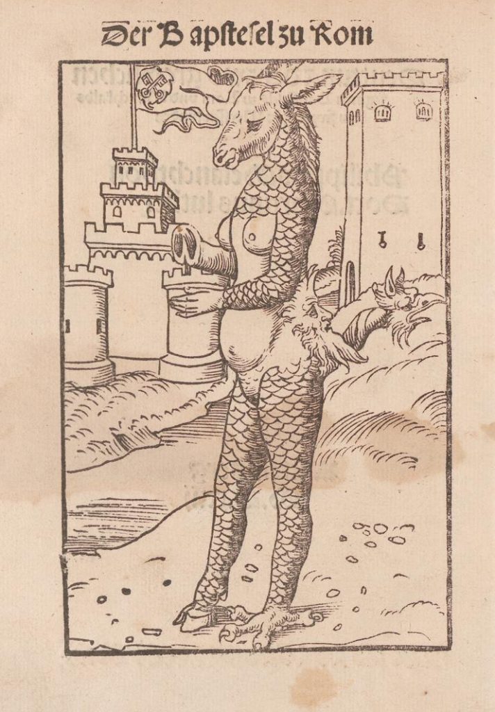 Eén uit de directe omgeving van Luther (Lucas Cranach, de ondernemer-drukker-graveur-schilder van Wittenberg), de ander uit de groep van Luthers’ tegenstanders. De eerstgenoemde borduurt voort op een anti-pauselijke prent over een ‘gedrocht’ dat ooit zou zijn aangespoeld in Rome, vlakbij de Engelenburcht. Een vrouw met een ezelskop en allerlei dierlijke extremiteiten. Pure fantasie natuurlijk, maar fake news floreert als er groepsidentiteiten moeten worden bevestigd/beklad. De Luthersen zagen hierin een teken van God, en de ezel kreeg de naam ‘Bapstesel’: paus-ezel. Men zag er een allegorie in van de roomse kerk. Dat het hoofd van die kerk een ezelskop is kwam goed uit…