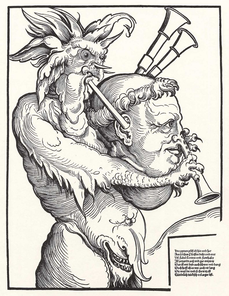 De tweede is een afbeelding van Luther, die – volgens de rome-getrouwe gelovigen – natuurlijk niet iemand kan zijn die ‘vragen stelt’ die misschien wel ergens op slaan. Natuurlijk niet, dan zou je moeten gaan nadenken over de status quo en dat leidt alleen maar tot revolutie. Neen, die Luther is een instrument in de handen van de duivel: Luthers kop (nog als monnik, met tonsuur) is een doedelzak die de duivel gebruikt om de mensen naar ‘zijn pijpen te laten dansen’.