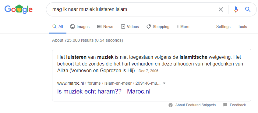 Dan zou je zeggen: okay, het maakt dus niet uit – de koran zwijgt erover. het is in orde. Maar dat is buiten de waard gerekend. In de overleveringen (Hadith, Soenna) zijn er plenty uitspraken over muziek te vinden. En die maken er een probleem van. Logisch, anders zou er ook in die teksten geen woord over muziek hebben gestaan. Immers: alles wat geen probleem is, blijft buiten beeld in religieuze teksten tot iemand er een probleem van maakt. En dan kom je er nooit meer af. Zeker niet binnen de islam omdat daar traditionele teksten gezag hebben, terwijl er tegelijk een onoplosbare discussie woedt over welke teksten wel/niet en in welke rangorde. Dat is een straatje zonder einde. En pas op: De scherpslijpers (zeloten) zijn altijd ijveriger in hun propaganda dan de gematigden. Kijk maar eenswat de door google bevoorrechte ’treffer’ (featured snippet) zegt als ik de vraag intik: