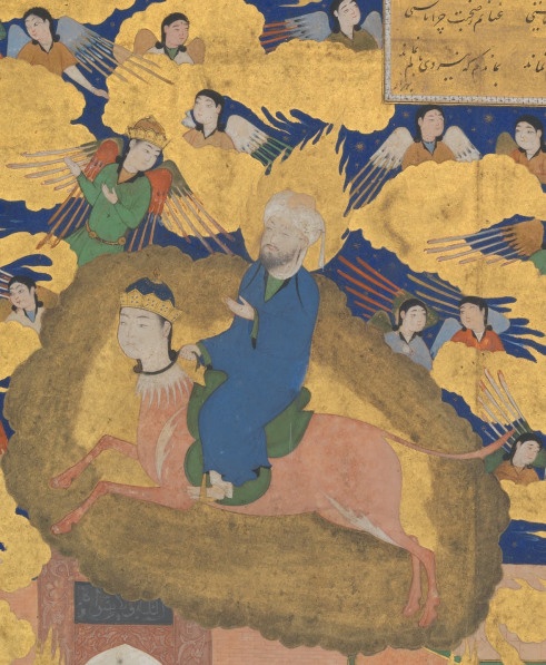 Terwijl ik sliep binnen de omheining van mijn woning kwam Gabriël bij mij en stootte mij aan met zijn voet. Ik ging overeind zitten maar ik zag niets en ging weer liggen. Hij kwam nogmaals bij mij en stootte me aan met zijn voet. Weer ging ik overeind zitten, maar ik zag niets en ging dus weer liggen. Tenslotte kwam hij voor de derde maal en stootte me aan met zijn voet. Toen ik overeind ging zitten, greep hij mij bij mijn bovenarm. Ik stond op en hij bracht mij naar buiten, naar de deur van mijn woning. Daar stond een wit rijdier, iets tussen een muildier en een ezel in, met vleugels aan zijn flanken waarmee het zijn achterpoten aandreef, terwijl het zijn voorpoten telkens neerzette tot waar zijn oog reikte. Daar zette hij mij op, en hij voerde mij mee en bleef voortdurend dicht bij mij’.