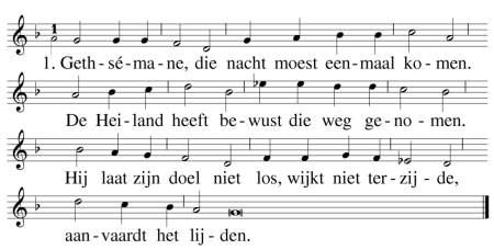 Meditatie over de nacht in de hof van Olijven, Gethsémane. De auteur focust vooral op de tegenstelling tussen Jezus waakzaamheid en het inslapen van de discipelen. In strofe 5 wordt de overdenking van Blaise Pascal over Jezus ‘agonie’ geciteerd (zie bij gezang 176). Meer over de melodie, zie bij gezang 181.