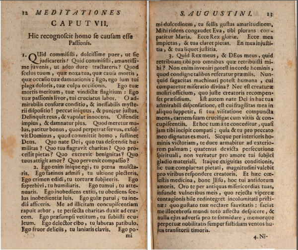 In het opschrift neemt Crüger de helft van de titel over: Des leydens Christi Ursach en handhaaft ook Heermann's bronvermelding: aus Augustino. Het is een meditatie over de vraag: waarom moest Christus eigenlijk lijden? De aanzet daartoe had Heermann gevonden bij Augustinus, zegt hij/denkt hij. Historisch is dit niet correct, maar dat kon hij niet weten. Hij heeft ongetwijfeld een boekje gelezen met de titel Divi Augustini Meditationes.... of iets dergelijks. Dat was een devotionele bloemlezing uit de Middeleeuwen, een meditatieve bestseller. De echte bron is niet een geschrift van Augustinus zelf, maar een reeks meditaties over God/Vader-Zoon-Heilige Geest die onder die titel een bestseller zijn geworden. Basis van deze compilate legde een Benedictijner abt uit Fécamp (klooster de la trinité, overleden 1087). Deze liet zich in zijn persoonlijke meditaties (gebeden) over God (en dus ook over het lijden van Christus) voeden door Augustinus, later aangevuld - door hemzelf of anderen, dat is onduidelijk - met gedachten van Anselmus (Cur Deus homo - herkent u het?), maar ook door hymnen, gebedsformules en bijbelteksten. Hij schreef ze waarschijnlijk eerst voor zichzelf, èn nadien om het innerlijk leven van de monniken (en nonnen) te verbeteren. Dat was zijn missie als abt. Ze werden snel populair (d.w.z. gekopieerd, verspreid, zonder naam van de auteur, en aangevuld met soortgelijke teksten. Eerst heten ze supputationes sancti Augustini. Later meditationes. Dat ze op naam van Augustinus waren gesteld (te goeder trouw, maar verkoopt ook wel goed) zal ook wel geholpen hebben. Erasmus had overigens al z'n twijfels, las ik bij Migne (de officële uitgave uit de 19de eeuw. Ook Mabillon weet al dat Jean de Fécamp (Johannes Fiscamnensis) waarschijnlijk de auteur van het merendeel van de teksten is (gezien de inleidingen in de Patrologia Latina). Bij middeleeuwse kopieën (manuscript) nam men vaak de vrijheid om uit te breiden, te herordenen, maar de teksten van de Meditationes zoals wij die nu nog steeds kennen bleven intact. Zo zijn ze hèt meditatieboek van vele eeuwen christenen geworden. Je hoort passages, gedachtengangen hieruit meeklinken als Luther preekt, als Josquin een geestelijk motet toonzet, als Schütz hetzelfde nog eens overdoet (in Latijn en het Duits), en dus als je Herzliebster Jesu zingt. Hieronder de eerste pagina's van hoofdstuk VII, zoals die voorkomen in een druk uit 1755 (maar deze is gebaseerd op een editie uit de late 16de eeuw van Henri de Sommal (Sommalius); en ook de protestantse versie van Andreas Musculus, Precationes uit 1571, talloze malen herdrukt, wijzigt in deze tekst niets). De meditatie begint met de vraag: Quid commisisti, dulcissime puer, ut se judicareris? Quid commisisti, amantissime juvenis, ut adeo dure tractareris. Quod scelus tuum.. etc. U herkent het wel, ook als u geen Latijn kent: Wat heb je misdaan, jongeling, dat je wordt veroordeeld, dat men u zo mishandelt? Wat is je overtreding? etc... Waarna in de tekst de 'vrolijke ruil' (zoals Luther dat later is gaan noemen, maar hij is dus niet de uitvinder ervan) wordt beschreven: De onrechtvaardige zondigt en de rechtvaardige wordt gestraft... Wat de slechterik gedaan heeft, lijdt de goede etc... Trouwens: Zoals gezegd: Heinrich Schütz heeft deze tekst getoonzet, letterlijk (SWV 56: Quid commisisti). - CPDL, Cantiones Sacrae, 1625 (5 jaar eerder dan Heermann's lied)... Zie hierover: https://culture.wursten.be/quid-commisisti-herzliebster-jesu/