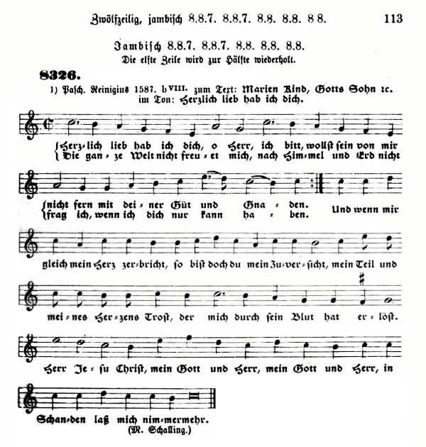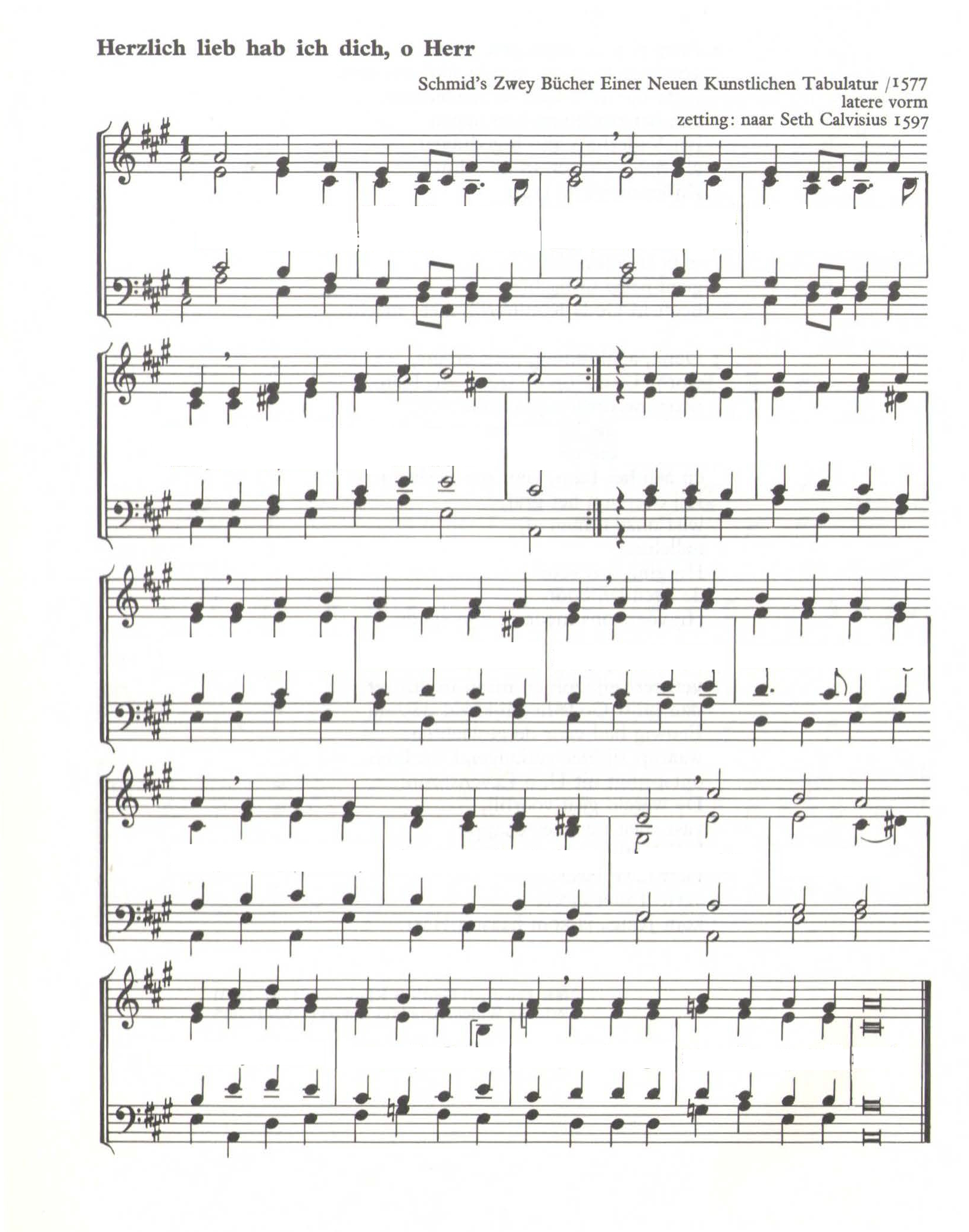 1. Herzlich lieb... Door de lange beginnoot wordt de tweede lettergreep ook betekenisvol samen met de derde (als begin van een nieuwe versvoet - jambe). Drie achter elkaar dus. Herz-lich lieb... Heinrich Schütz maakt in zijn zetting van deze drie noten zelfs het beginmotief.