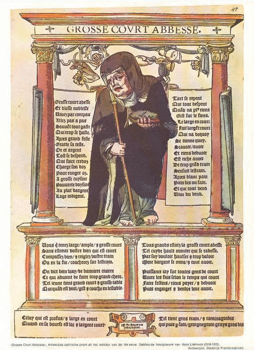 The 'tric'of the satire (the pun) is based on the homonymia of ‘Grosse Courte Abesse’= Fat short abbess (= image) and the openingphrase of the poem, which is/sounds the same but should be understood as if was written ‘Grosse court abaisse’= An exuberant lifestyle debases