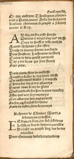 [broadsheet of the Beda-clan] Au feu, au feu, ceste heresie Qui jour et nuyct trop nous blesse: Doys tu souffrir qu’elle moleste Saincte Escripture et ses esdictz? Veulx tu bannyr science parfaicte Pour soustenir Lutheriens mesdictz? Crains tu dieu qu’il le permecte Toy et tes biens qui sont fleuris Face perir? Paris, Paris, fleur de noblesse, Soustien la loy de toy qu’on blesse, Ou aultrement fouldre et tempeste Cherra sus toy, je t’en advertys. Prions tous le roy de gloire Qu’il confunde ces hereticques mauldictz, Affin qu’il n’en soyt plus memoyre, Non plus que des aulx pourriz. Au feu, au feu, c’est le repaire, Faictz en justice, dieu l’a permys.
