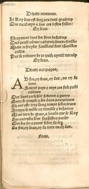 Dizain a ce propos Au feu, en l’eau, en l’air ou en la terre, Soient pris et mis ces folz predicateurs, Qui vont preschant sedition, & guerre, Entre le peuple et les bons precepteurs. Ilz ont esté trop long temps seducteurs, Et mis le monde en trouble, & desarroy. Mais Dieu de grâce ha voulu, que le Roy Aye entendu leur sophistic parler, Qui les fera punir selon la loy, Au feu, en l’air, [3] en la terre, ou en l’air.