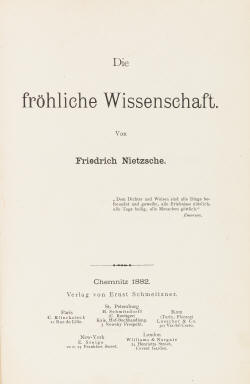 Hierboven de titelpagina van de eerste editie (1882). De vrolijke wetenschap bestaat dan nog maar uit vier boeken, eindigend met de verschijning van Zarathustra (nr. 342: titel: Incipit tragoedia, met als laatste zin: Aldus begon de ondergang van Zarathustra - tekst voor 99% gelijk aan het begin van Also sprach Zarathustra, Nietzsche's volgende boek (1883).
