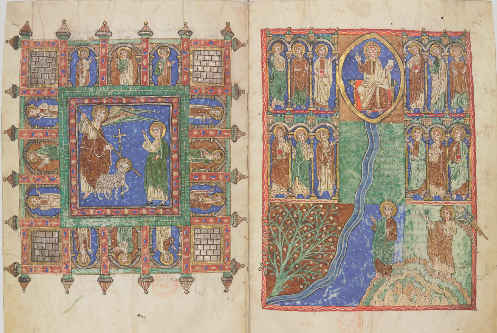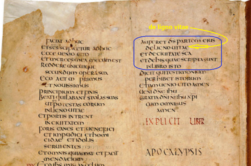 Wellicht dus een kopieerfout tijdens het overschrijven. Komt bij: het begrip 'librum vitae' past ook goed bij de gedachtengang. Niet zozeer 'weggenomen' (afgehakt) van de lignum vitae (boom des levens), maar weggenomen (geschrapt) uit het librum vitae (boek des levens). Goed, kan gebeuren. Vast niet opzettelijk of met kwade bedoelingen. En ook niet zo erg. Ook het beroemde geïllustreerde commentaar (bloemlezing van de beste kerkvaderlijke commentatoren, m.n. Tyconius, Augustinus etc.) uit de 8ste eeuw toegeschreven aan Beatus van Liébana, schijnt librum te bevatten (ik heb het niet kunnen controleren/vinden),zeer bekend vanwege de geïntegreerde full colour afbeeldingen). Geen boom des levens , maar boek des levens er in de Latijnse tekst. In de vertaling mag de boom des levens dan wel verdwenen zijn, in de verbeelding niet. Ze staat stevig geplant in het begin van het hoofdstuk (Apoc 22:2), bij de rivier van het kristalheldere water des levens...