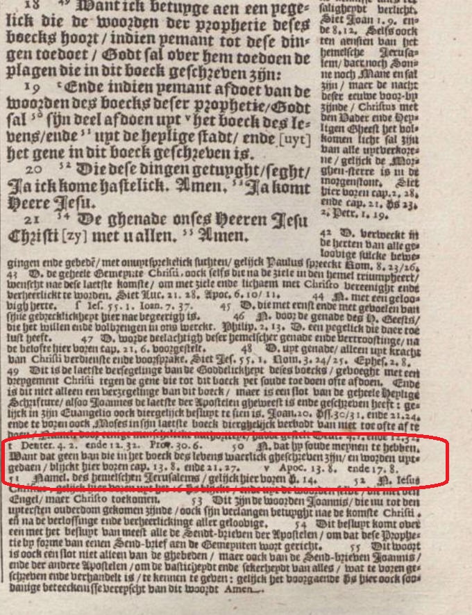 In de kanttekeningen bij Openbaring geven de Statenvertalers geregeld tekstkritische opmerkingen wanneer zij die belangrijk achtten (bijvoorbeeld: “Anderen lezen…”), maar bij 22:19 ontbreekt zo’n opmerking.
