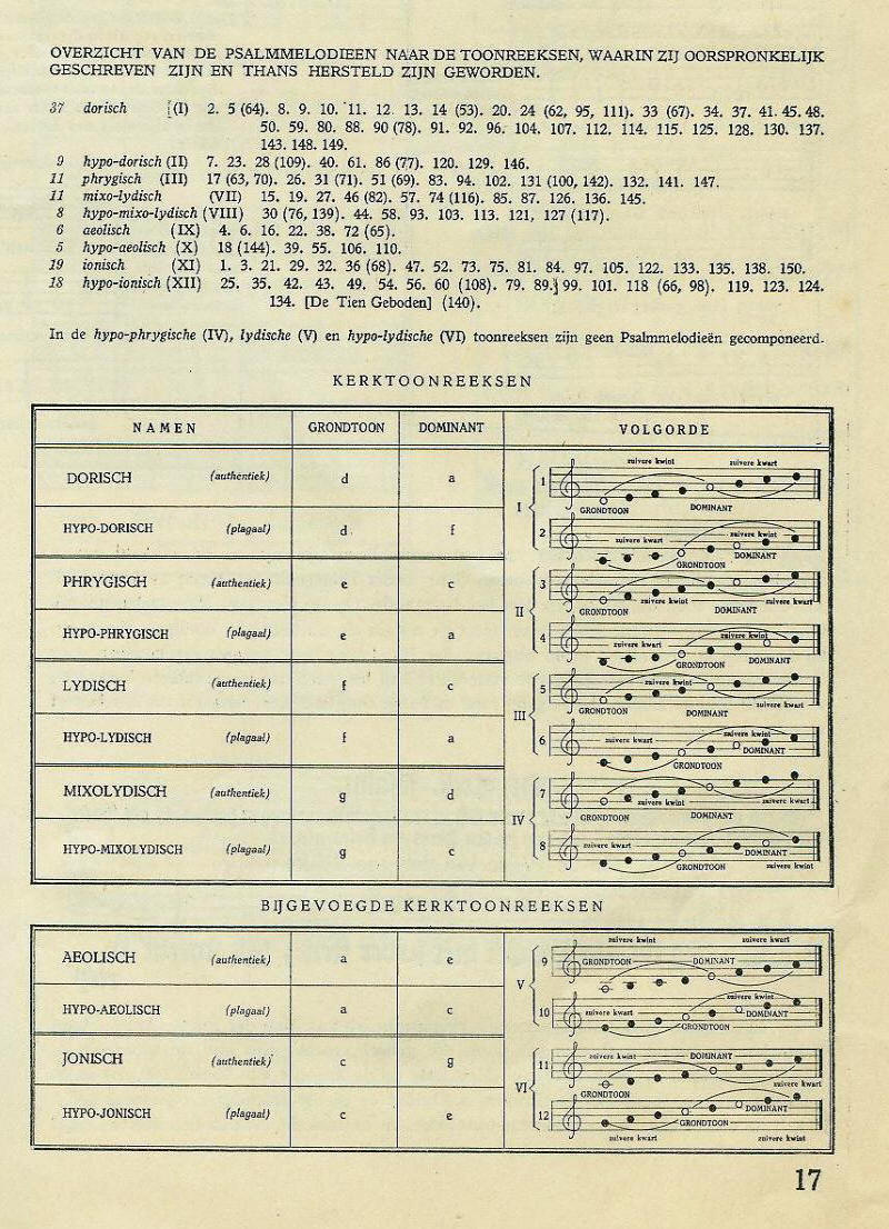 Afin: de aloude H. Hasper heeft in 1936 de Psalmen opnieuw gepubliceerd in de oorspronkelijke kerktoonsoorten (helaas: ontsierd door enkele vreemde misvattingen) en met zijn eigen berijming (helaas: poëtisch ondermaats). Hij hoopte - en zijn grondidee kan niet genoeg geprezen worden - hiermee een oecumenisch Psalmboek aan het Nederlandse volk te geven. In een speciale bijlage legt hij uit hoe men die kerktoonsoorten moet verstaan en zingen. De bijlage was enkel bedoeld voor de protestanten..., want de katholieken konden het volgens Hasper vanzelf want die hoorden elke zondag de kerktoonsoorten nog in de Gregoriaanse mis en andere gezangen. Een overzicht van de melodieën en de toonreeksen drukt hij af op p. 17 van dit addendum van zijn uitgave van het Boek der Psalmen.