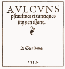 In September of 1541 Calvin was called back to Geneva, and the next year another Psalm collection was published entitled; "LA FORME DES PRIERES ET CHANTZ ECCLESIASTIQUES" (The Form of Prayers and Ecclesiastical Songs). The book opens with an unsigned letter to the readers. Calvin is most certainly the author. Seven-eighths of it talks about the order of worship and the administration of the sacraments. The last paragraphs deal with the singing. In addition to the 13 Psalms of Marot, 5 by Calvin plus the Song of Simeon and the Ten Commandments taken from "Aulcuns Pseaulms", the "Ecclesiastical Songs" contained 17 new texts by Marot set to music. Of these melodies those for the Psalms 4, 5, 6, 7, 8, 13, 14, 19, 22, 24, 38, 104 and 115 were maintained in successive editions. Who was the composer of these tunes? Shortly before Calvin's return to Geneva a Parisian musician, Guillaurne Franc, arrived in the city. He received permission to open a "music-school".