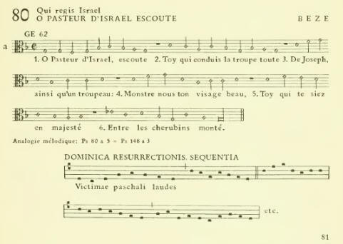 The composer is thoroughly at home in polyphony, which is apparent from certain melodic fragments that can be combined like invertible counterpoint. A typical example of this is, Psalm 99, which is the contrapunctus of Psalm 47 by Bourgeois. See also Psalm 54 the first and the last lines which may be combined with the fourth one; and Psalm 89 line 5 against 4. Also some of the psalms of 1562 are inspired by the old repertoire: Psalm 55 is closely related to the hymn "Lauda Sion Salvatorem", Psalm 58 is reminiscent of the Credo III. Psalm 141 is a remarkable transcription of the hymn "Conditor alme siderum", and the melody of the sequence[3] "Victimae paschali laudes" forms the basis for psalm 80 [see remark above]. By means of notes - as the Biblia pauperum did by means of pictures - the Christian Easter is connected with the Jewish Passover, an inspiration which can only come to an author who is equally at home in musical composition as in the convolutions of Biblical exegesis.