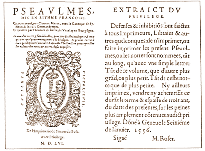 Even though the work of rhyming stagnated, the same cannot be said for the Genevan printers. The printing firms cleverly competed for customers and licenses. In 1539 [= 1559] the Council granted the precentor Pierre Vallette a license to print music in a manner that he had invented, for three years. That license Vallete handed over the next day to Jehan Bonnefoy, Michel Blanchier and Etienne Coret, all Geneva printers. In 1560 Pierre Davantès, nick-named Antesignamus, in turn obtained a three year license for a "new type of music printing". On June 19th Antoine Reboul and Emery Bernhardt were empowered to print the psalms "with a new kind of music printing". On June 24th "Jean Rivery requested permission to print the psalms with the note names and scales at the beginning". On March 24, of the same year, however, a request, dated November 12th, by Jean Rivery, in which he asks to print the psalms "with annotations the unrhymed text and with a prayer at the end of each psalm", was denied, more so because" Mr. Bèze will have the complete French Psalter printed presently".