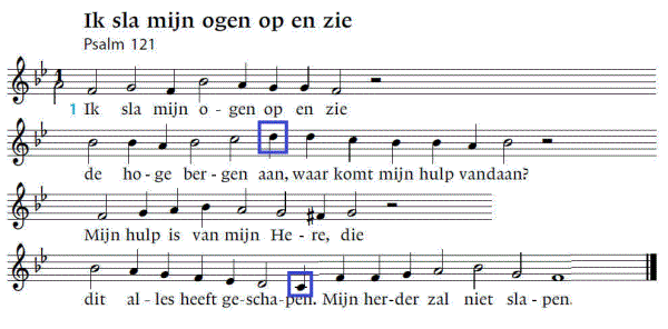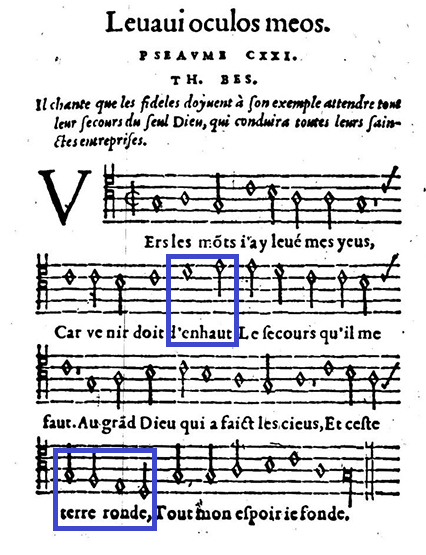 Een opvallend aspect van deze melodie is de relatief grote ambitus (toonomvang): van c tot d in onze notatie. De plaats waar de melodie haar hoogte- en dieptepunt bereikt, is beslist niet toevallig. Daarvoor hoef je enkel de oorspronkelijk Franse tekst van Thodore de Bze bij de noten te plaatsen. Het hoogtepunt bij de woorden en haut (naar boven, de hemel, regel 2) en het dieptepunt bij terre ronde ('het aardrond' , regel 5 - in de berijming van 1773: die hemel schiep en aarde). U ziet dit universum voor u als u de melodie afdrukt rekening houdend met de rusten (die ontbreken tussen 2/3 en 5/6). Een simpel voorbeeld van tekstschildering, die - logisch - enkel voor het eerste couplet zinvol is. De kunst was natuurlijk om dit zo natuurlijk te doen, dat het de melodie zelf niet schaadt. Gelukt, zou ik zeggen. Als u zin hebt moet u dan ook nog eens luisteren naar J.Pzn. Sweelinck met deze psalm doet, op precies die momenten (uitvoering: Gesualdo consort, o.l.v. Harry van der Kamp)