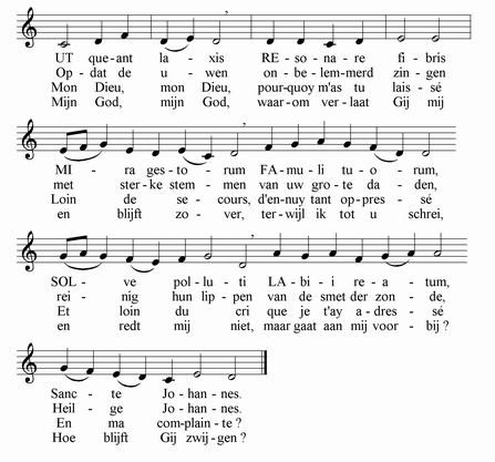 D.w.z. deze psalm kan gezongen worden op de wijze van de beroemde solmiseringshymne (om do-re-mi-fa-sol te leren zingen) van (of beter: toegewezen aan) Guido van Arezzo (overl. 1050). Met enige aanpassing – maar daar deed men toen zeker niet moeilijk over – lukt het inderdaad om deze psalm op deze melodie te zingen...