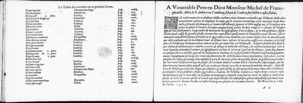 Jardin musical, Cauléry himself wrote the dedication, addressing it to his cousin, Michel de Francqueville, Abbot of St. Aubert in Cambrai. Cauléry contributed ten compositions, four of which are on sacred texts by Marot (Ps. 13, the Lord's Prayer, the