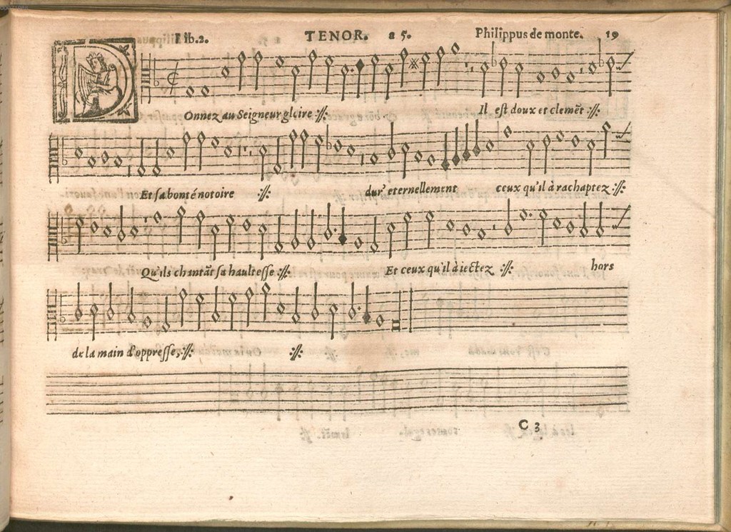 Only one setting of a French Psalm by De Monte is known. Psalm 107. It was published by Phalèse in Louvain in 1570 in a collection together with spiritual songs by Lassus and De Rore. The sheet music can be found in this collection, and a recording is available in the side panel. Plus: see image below