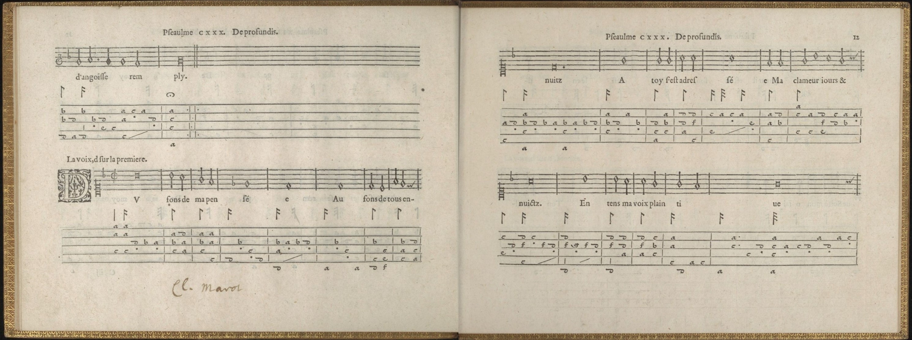 Already in 1545/6 Pierre Certon published 31 Psalm settings, in a duo publication with Antoine (de) Morable. In 1555 Certon completed the Psalter, publishing Cinquante Pseaulmes de David... dedicated to Diane de Poitiers. Only the Tenor partbook survives. In 1554 Guillaume Morlaye, lutenist/composer/music-editor published a selection of Certon's Psalms intavolated for lute. An example how that sounds, when a tenor sings the tune (NB: not as an ecclesial (liturgical) Psalmsong, but as a true 'chanson spirituel', in Parisian style, for which Certon and De Sermisy are famous). What you hear is the famous penitential Psalm 'De profundis' rendered into French verse by Clément Marot: Du fond de ma pensée (performed by Chant1450). Below an image of the tabulature.