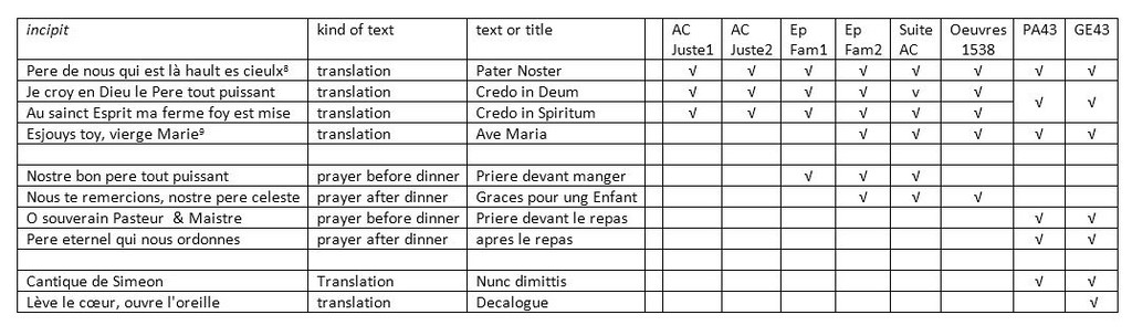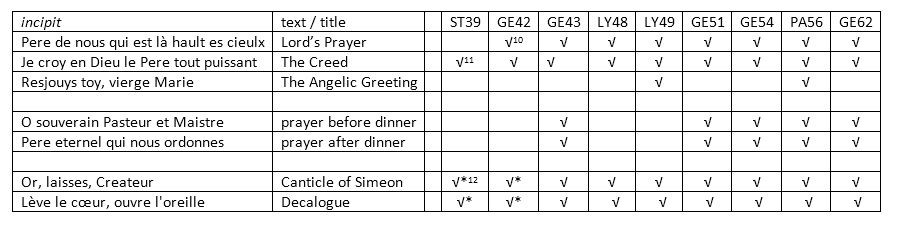 In the Paris edition of Marot's Psalm poem (1543, Roffet, Paris) the last of the Psalm poems is not a Psalm, but a song: the Canticle of Simeon (Or, laisses, Createur). In a seperate part we find the Lord’s Prayer, the Creed and the Angelic Salutation (with only slight changes in the text). The prandial prayers in this edition are new and replace the predecessors of L’Instruction (and La Suite): Before dinner: O Souverain Pasteur et Maistre and the Grae after the meal : Pere eternel, qui nous ordonne.. The Geneva text edition (1543, Girard) includes alos the Ten Commandments: Lève le coeur. From then on these extra’s become part and parcel of the hymnbook (or book of common prayer) of the Reforming Churches, issu de Calvin. First often with melodies, but gradually only as texts for private devotion. The Ten Commandments and the Canticle of Simeon became part of the liturgical order, so they kept their tunes. Below a schematic overview.